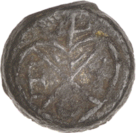 by a cross, within a beaded circle. Surrounded by the legend. |