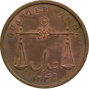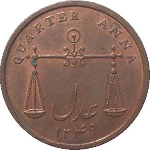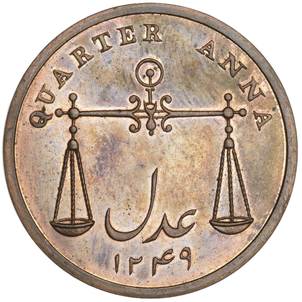 All other broad rim half annas, quarter annas and pie proofs seen have axis ↑↑ |
