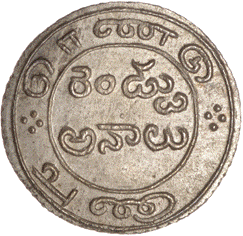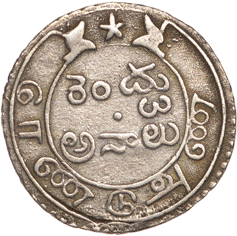 value in English below. Within a toothed rim. (Telugu = Kampini varuvesana Ara